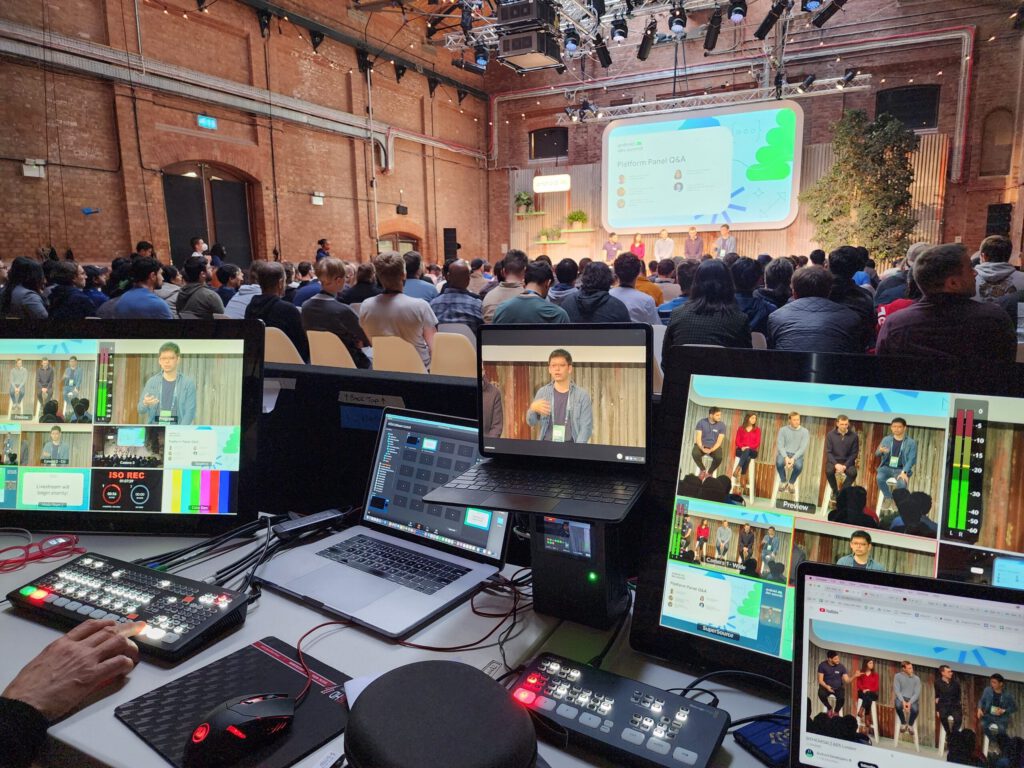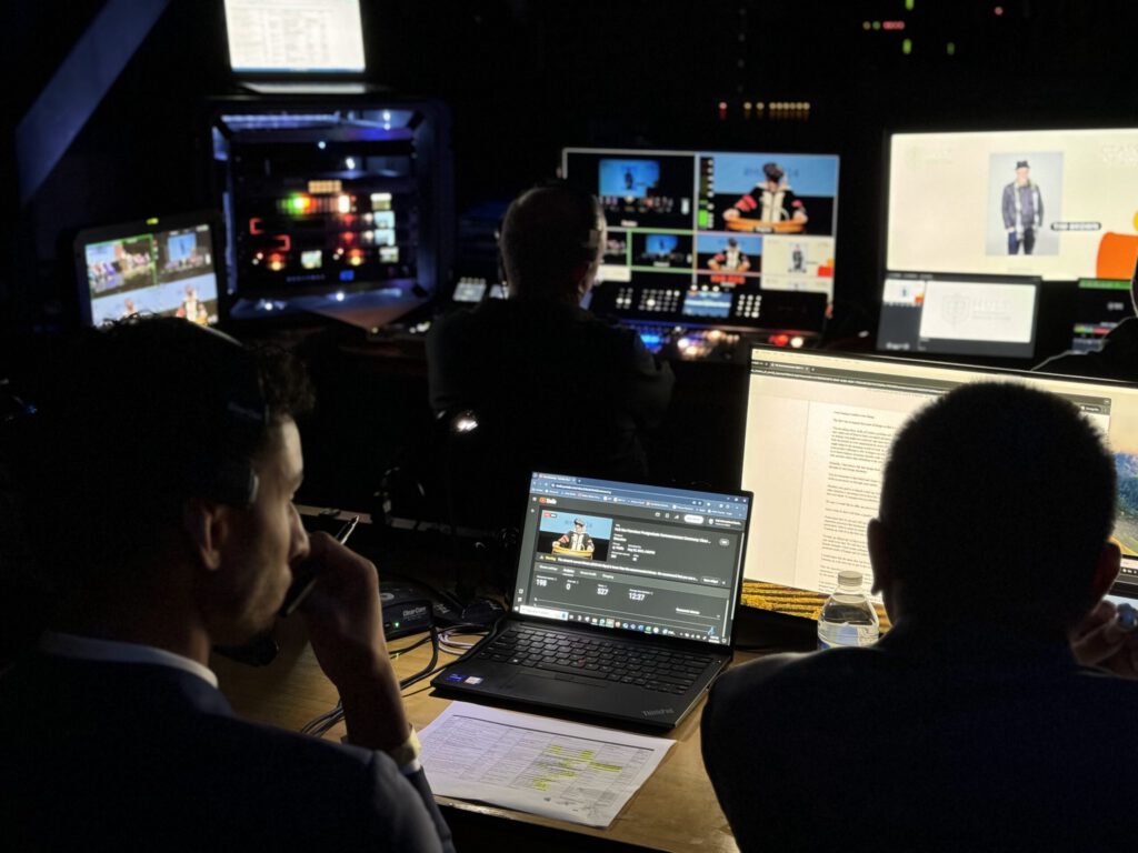 Seamless integration between in-room and remote audiences. Camera packages, switching, encoding, and remote participant workflows — built for events where both sides of the screen matter.